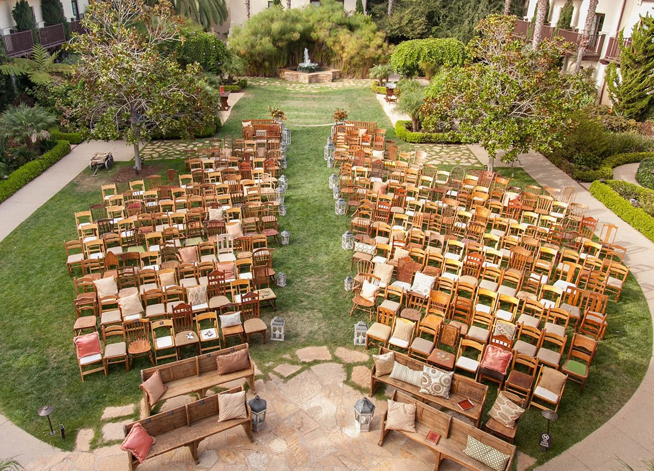 Wooden chairs or wooden benches, hay bales, trestle bench seating, a mixture of chair types, camp chairs, beach chairs, cushions, wicker chairs, etc..